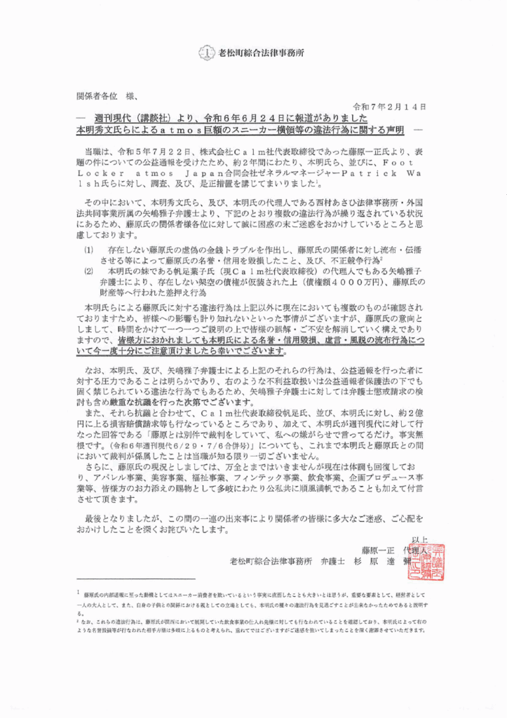 週刊現代(講談社)より、令和6年6月24日に報道がありました 本明秀文氏らによるa t mo s巨額のスニーカー横領等の違法行為に関する声明